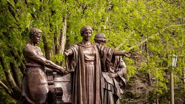 Now positioned at the west gateway to the University on Green and Wright Streets, stood until 1962 behind Foellinger Auditorium on the south campus—where romantically inclined students were wont to keep the throne “shiny and well used.” Designed by University graduate Lorado Taft, the statue was unveiled on June 12, 1929. The Alma Mater is shown “as a benign and majestic woman in scholastic robes, who rises from her throne and advances a step with outstretched arms, a gesture of generously greeting her children” (Taft). Learning and Labor flank the main figure. An inscription reads: To thy happy children of the future those of the past send greetings.